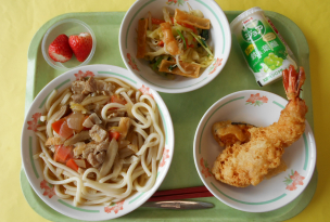 豚肉…群馬、えび…インドネシア、ちりめんじゃこ…瀬戸内産、ほうれん草…埼玉、キャベツ…愛知、かぼちゃ…ニュージーランド、長葱…千葉、玉葱…北海道、ごぼう…青森、人参…埼玉、もやし…福島、いちご…栃木