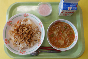 豚肉…群馬、ちりめんじゃこ…瀬戸内産、さやいんげん…鹿児島、玉葱…北海道、人参…千葉