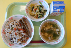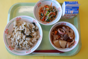 5年生が家庭科の授業でわかめの学習を行いました。給食では、ご飯にはわかめの葉の部分を、サラダには茎わかめを使用して、学習した内容の理解が深まるようにしています。