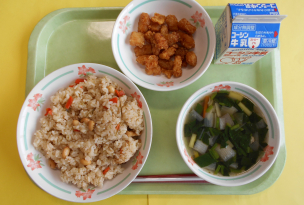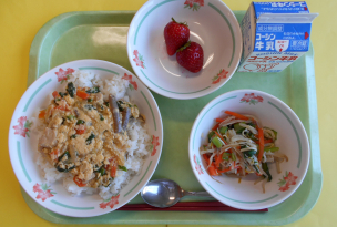 給食時間には、サラダから茎わかめを探したり、食感を楽しんだりしている様子が見られました。