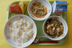 今日の献立は、夏野菜のなすが入ったマーボーなすです。なすが苦手な児童も多いですが、旬の食材に触れる機会をもってほしいので、献立に入れました。