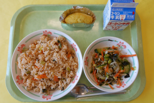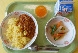 今週は、世界の料理週間です。カレーはインドでうまれた料理で、ひき肉のカレーをキーマカレーと言います。給食では大豆を茹でてみじん切りにして、野菜と一緒に煮込み、栄養たっぷりに作っています。普段のカレーよりスパイスを効かせて、気温が高い日も食べやすく仕上げました。