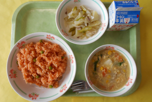 ご飯はサフランで色をつけたサフランライスです。高学年の児童からも「知らない」「どんな料理かわからない」と声をかけられました。給食時間は、サフランの花をみせて、色をつけたことを伝えると驚いた反応が見られました。