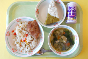 2学期最後の給食は、クリスマス献立です。デザートのケーキは、クリスマスツリーをイメージしたものです。給食室で抹茶のケーキを焼いた後、三角形にカットしてホワイトチョコレートでデコレーションしました。数日前から「お楽しみデザートって何ですか」とたくさんの児童が声をかけてくれました。今日は、給食時間に笑顔がたくさん見られ、楽しく食事ができていました。