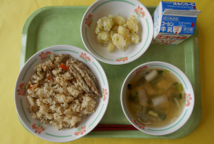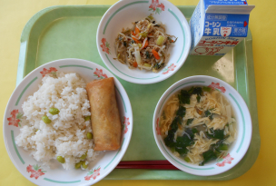 2年生がそらまめのさやむきをしました。「そらまめくんのベッド」という絵本を事前に読み聞かせし、絵本に出てくる仲間とそらまめの違いや、実際にさやむきをして、さやの中の様子を学びました。そらまめはゆでただけでは食べづらい児童もいるので、素揚げをし、スパイスと和えて味付けをしました。