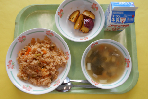 給食時間に梅が旬の話をすると、子どもたちからは「梅に旬があるの?」と驚いた様子だったので、校庭にある梅の木の実の話をすると、納得した様子でした。