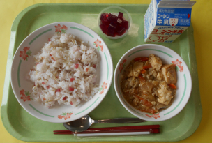 今日は季節の献立です。「梅雨」はこのころ梅の実が熟すことから「梅」の漢字が当てられています。給食室で、梅を混ぜ込んだご飯と、あじさいをイメージした2色のゼリーをつくりました。