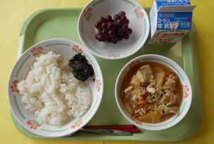 ブルーベリーが旬の季節になりました。友好都市の長野県伊那市でもブルーベリーの生産が行われています。今日は、フレッシュなブルーベリーを給食室でソースにしてパンナコッタの上にかけています。甘酸っぱい味ですが、低学年の児童もよく食べていました。