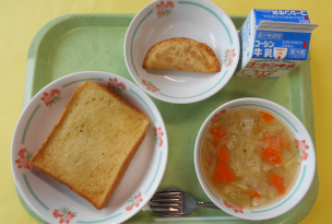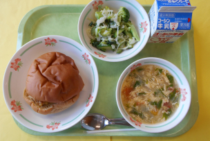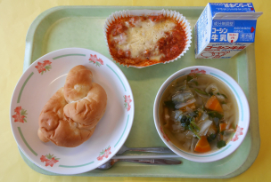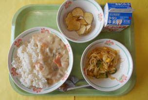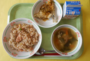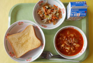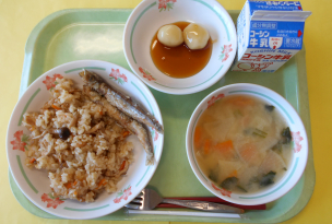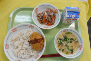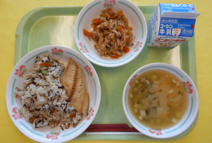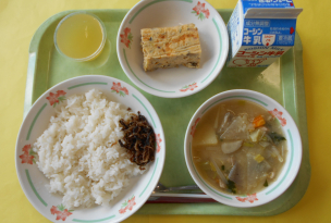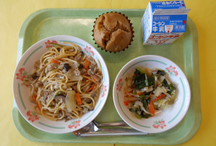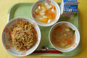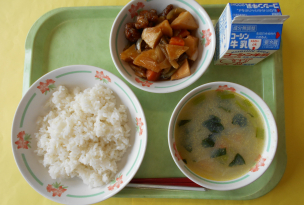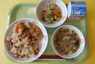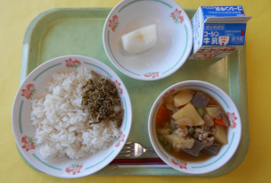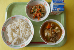 豚肉…茨城、鶏肉…岩手、卵…茨城、ちりめんじゃこ…兵庫、玉葱…北海道、人参…北海道、ごぼう…埼玉、人参…北海道、大根…北海道、もやし…栃木、じゃがいも…北海道、小松菜…群馬・茨城