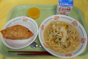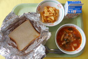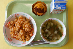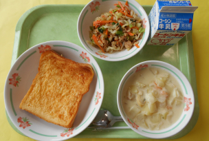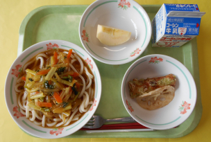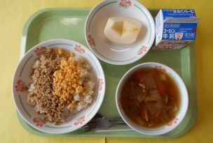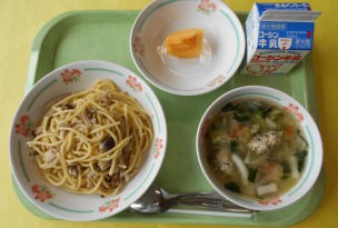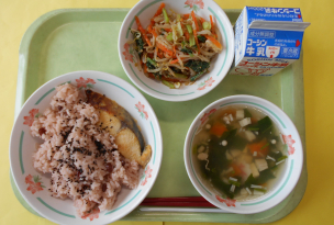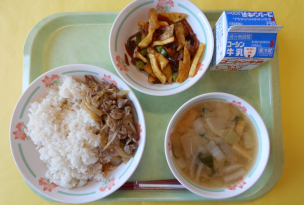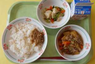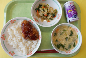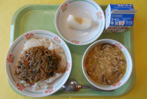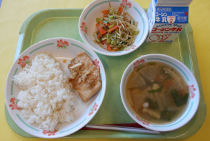 鶏肉…岩手、めかじき…静岡、ちりめんじゃこ…瀬戸内産、キャベツ…群馬、ごぼう…青森、ほうれん草…群馬、もやし…栃木、生姜…高知、人参…北海道、大根…群馬、ねぎ…長野(伊那市)、小松菜…長野(伊那市)