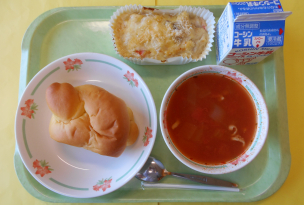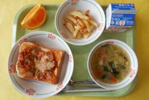 鶏肉…岩手、ベーコン…茨城、玉葱…北海道、ピーマン…茨城、じゃがいも…北海道、にんにく…青森、セロリ…長野、人参…北海道、キャベツ…茨城、小松原…群馬、オレンジ…オーストラリア
