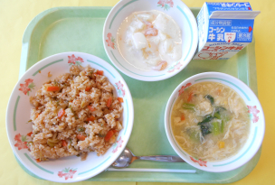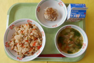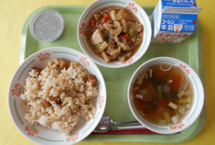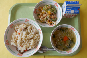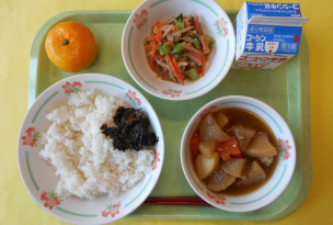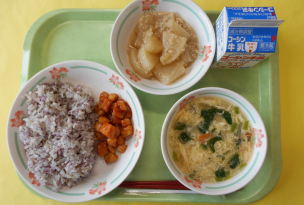 鶏肉…岩手、卵…茨城、ちりめんじゃこ…兵庫、いか…ペルー、大根…千葉、玉葱…北海道、人参…北海道、たけのこ…熊本、ほうれん草…群馬