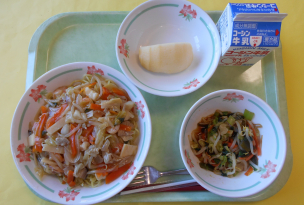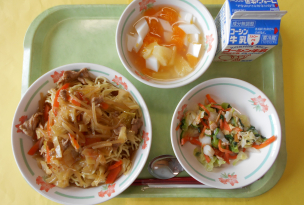 豚肉…茨城、いか…ペルー、むきえび…ミャンマー、にんにく…青森、生姜…高知、人参…北海道、たけのこ…兵庫、玉葱…北海道、もやし…栃木、キャベツ…東京、チンゲン菜…千葉、小松菜…群馬、りんご…長野(伊那市)