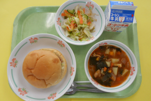 ベーコン…群馬、鶏肉…岩手、卵…群馬、キャベツ…群馬、じゃがいも…北海道、セロリ…愛知、ピーマン…茨城、もやし…福島、りんご…山形、黄ピーマン…山形、赤パプリカ…ニュージーランド、にんにく…青森、玉葱…北海道、人参…千葉