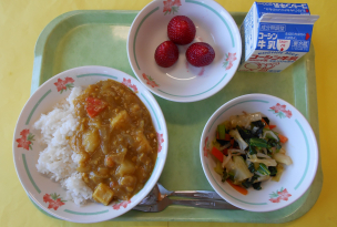 ベーコン…茨城、むきえび…インドネシア、あかいか…ペルー、にんにく…青森、生姜…高知、人参…鹿児島、じゃがいも…北海道、玉葱…北海道、小松菜…群馬、もやし…栃木、キャベツ…愛知、いちご…栃木