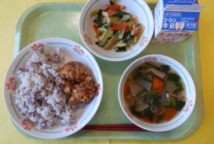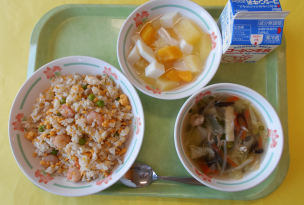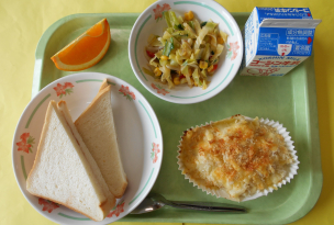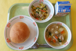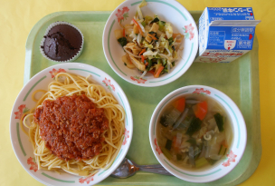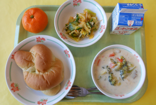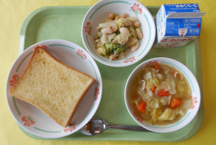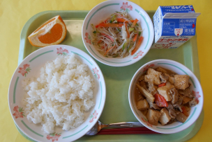 豚肉…茨城、あさり…中国、人参…鹿児島、じゃがいも…北海道、玉葱…北海道、さやいんげん…鹿児島、キャベツ…愛知、小松菜…群馬、もやし…栃木、みかん…山口