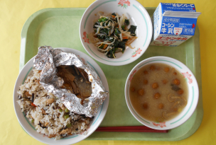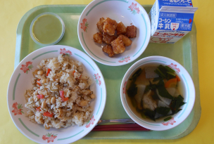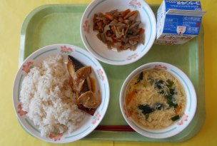 さば…欧州産、卵…茨城、生姜…高知、ごぼう…埼玉、れんこん…茨城、人参…鹿児島、さやいんげん…鹿児島、玉葱…北海道、たけのこ…熊本、ほうれん草…群馬