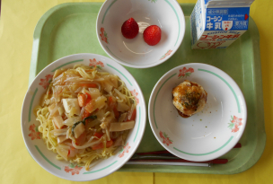 豚肉…群馬、えび…インドネシア、ちりめんじゃこ…瀬戸内産、ほうれん草…埼玉、キャベツ…愛知、かぼちゃ…ニュージーランド、長葱…千葉、玉葱…北海道、ごぼう…青森、人参…埼玉、もやし…福島、いちご…栃木