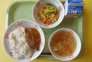 鶏肉…宮城、にんにく…香川、玉葱…佐賀、赤パプリカ…韓国、人参…青森、もやし…栃木、小松菜…群馬、キャベツ…群馬、じゃがいも…茨城