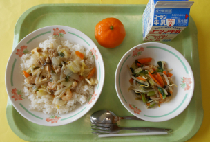 豚肉…茨城、むきえび…インドネシア、あかいか…ペルー。生姜…高知、玉葱…佐賀、たけのこ…兵庫、人参…青森、もやし…栃木、白菜…長野、チンゲン菜…千葉、キャベツ…群馬、小松菜…茨城